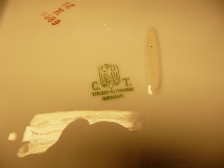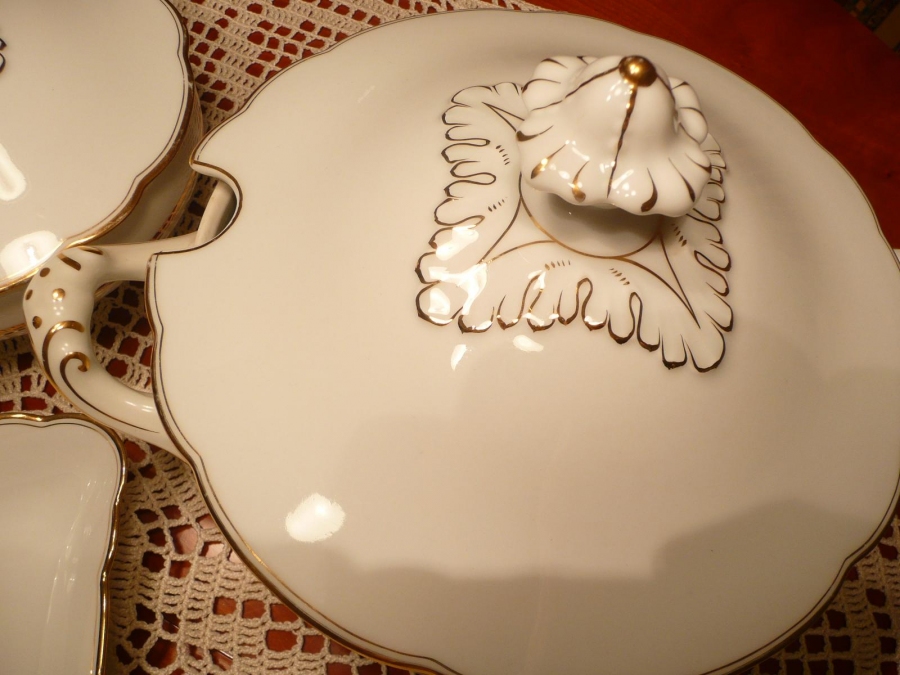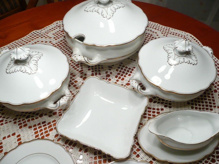 Wir haben ein Ess-Service mit einer großen Suppenschale mit Deckel, 2 Schalen mit Deckel, 2 Schalen, Fleischteller, je 12 Stück Kleine, flache und tiefe Teller. Die Teile sind in einem guten Zustand. Alle Teile haben einen Bodendruck 6866 II mit einer fortlaufenden Nummer.